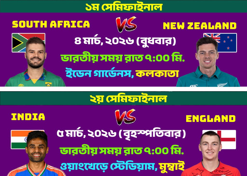 আগামী ৪ ও ৫ মার্চ ক্রিকেট বিশ্বের নজর থাকবে কলকাতা ও মুম্বাইয়ের দিকে। একদিকে দক্ষিণ আফ্রিকার গতির লড়াই নিউজিল্যান্ডের কৌশলের সাথে, অন্যদিকে ভারতের ব্যাটিং শক্তির পরীক্ষা হবে ইংল্যান্ডের অলরাউন্ড পারফরম্যান্সের বিপক্ষে। ৮ মার্চ আহমেদাবাদে ফাইনালের টিকিট নিশ্চিত করতে এই চারটি দল এখন তাদের সেরা প্রস্তুতির শেষ পর্যায়ে রয়েছে।